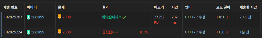 - 두 번째 기저 조건으로 cn이 z이고, cf가 true인 경우 dist[cn][cf]를 리턴한다.