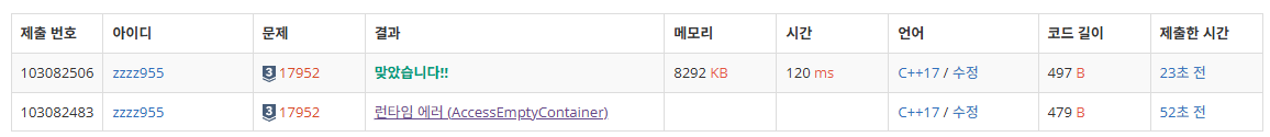 - stack의 back을 참조하기 전에 stack이 empty상태인지를 확인하는 로직을 추가하여 AC를 받았다.